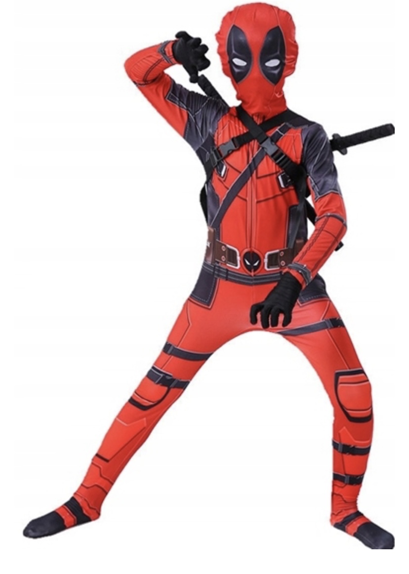 Deadpool jelmez overál maszkkal, 2 karddal, ami a hárta felvehető és 2 tőrrel. Anyaga kényelmes rugalmas.