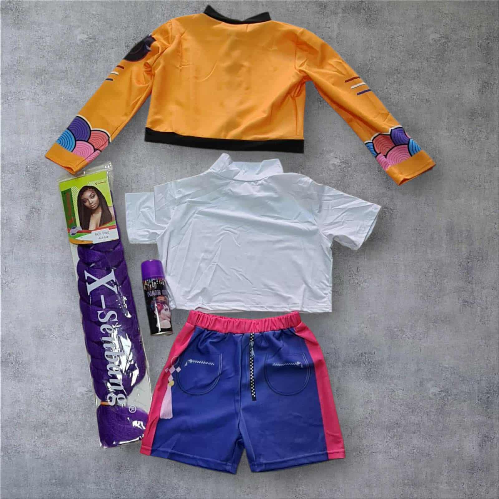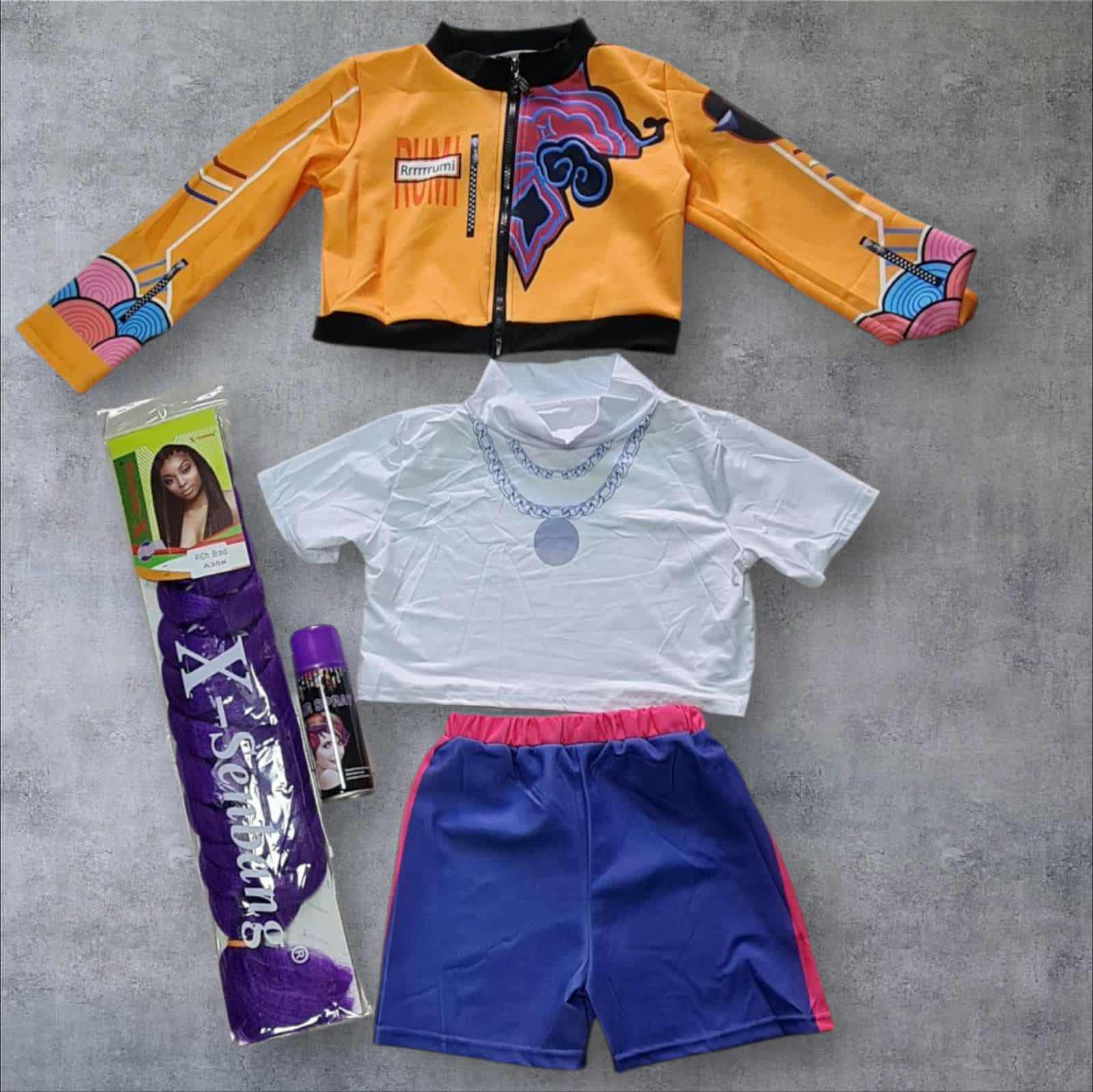 Rumi jelmez: kabát, felső nadrág, paróka és lila hajszínező egyben.